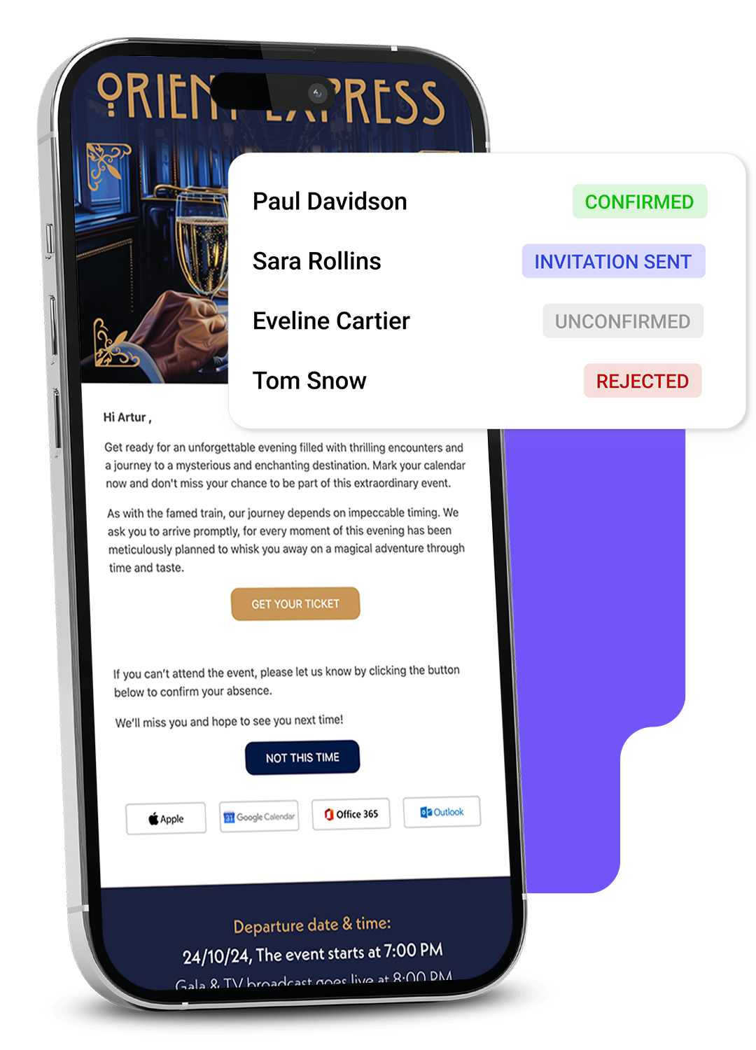 Zaimportuj listę gości i wyślij zaproszenia. Goście potwierdzają lub odrzucają udział, a statusy aktualizują się automatycznie.